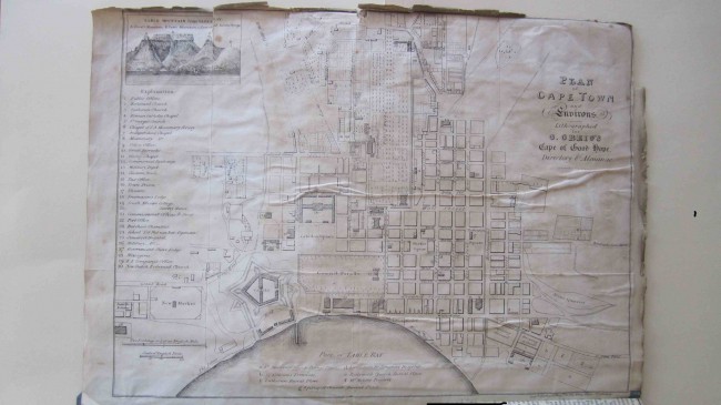 Lithographed plan, approximately 24 cm h x 32.5 cm w, laid to stub along lower edge, old folds and some age browning, 3 cm split in inset view of Table Mountain, upper edge worn and chipped, right edge trimmed close to border.
