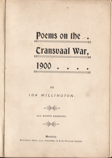 The poet Ida Millington seems to have lived in Hastings, Sussex. Her name is mentioned as having contributed poems to the official program published at the time of the opening of the South African War memorial erected in the town and which was unveiled in May 1903 by General Sir Leslie Rundle.