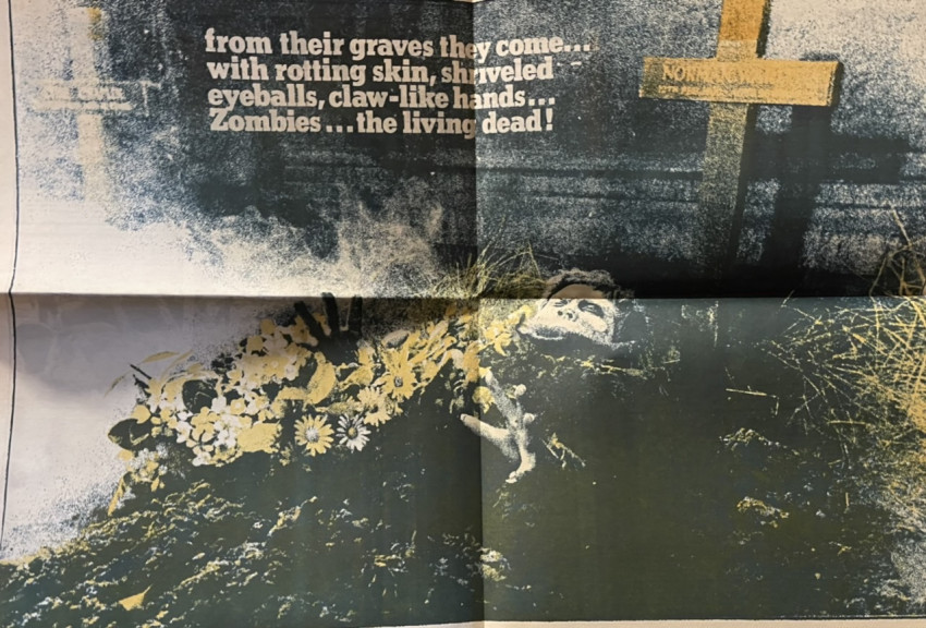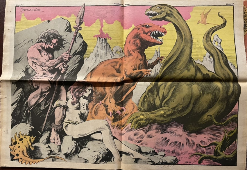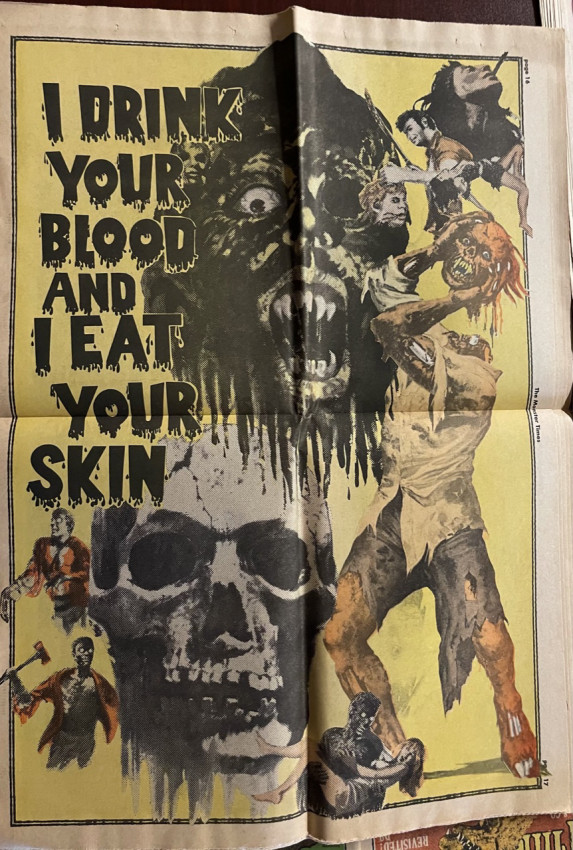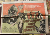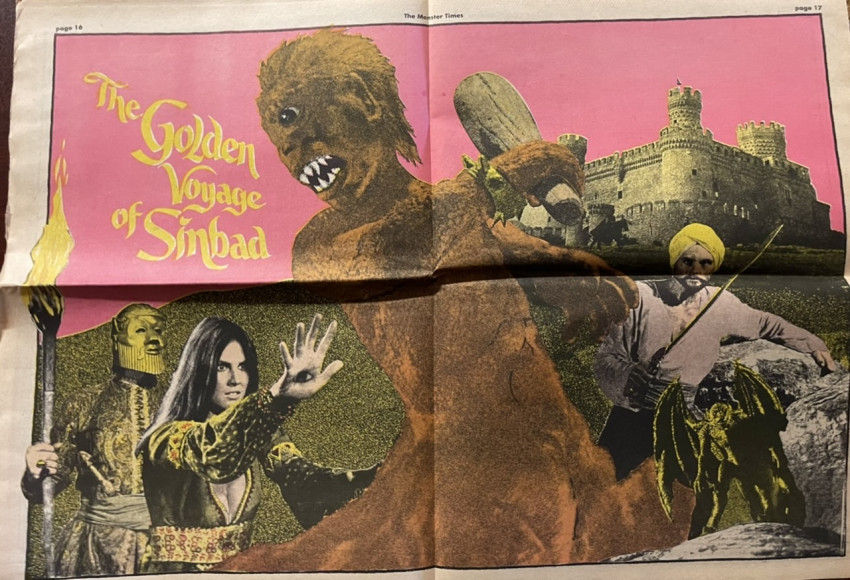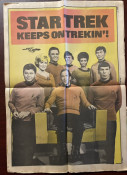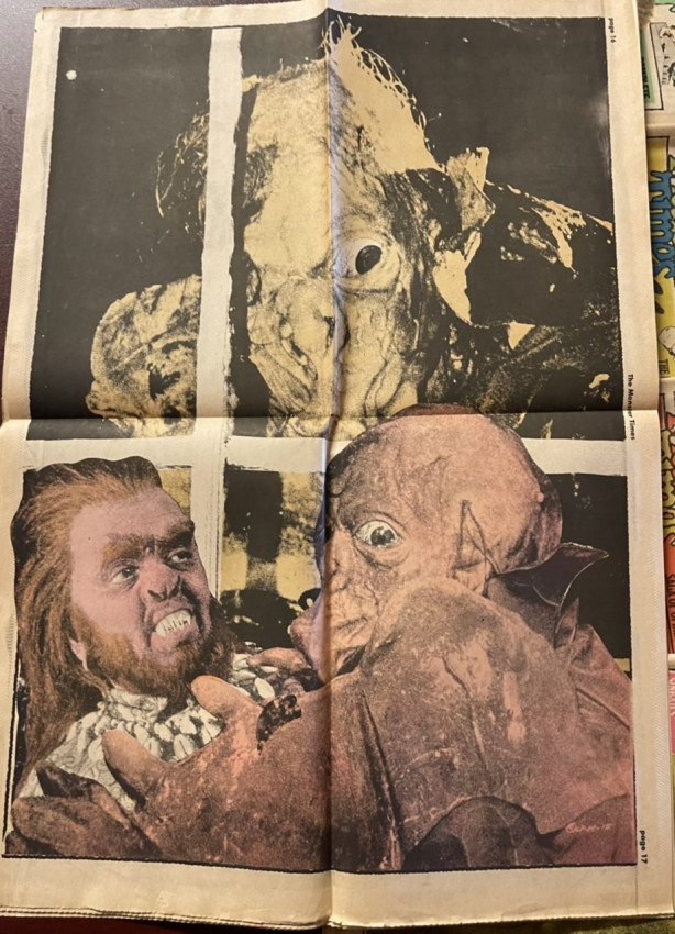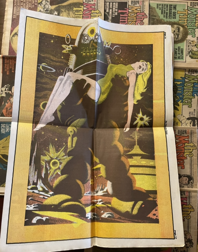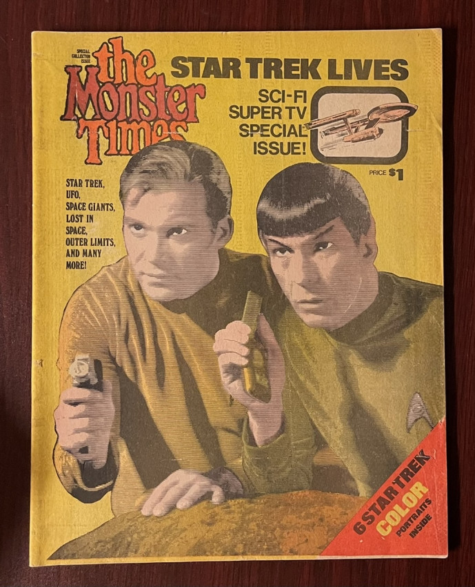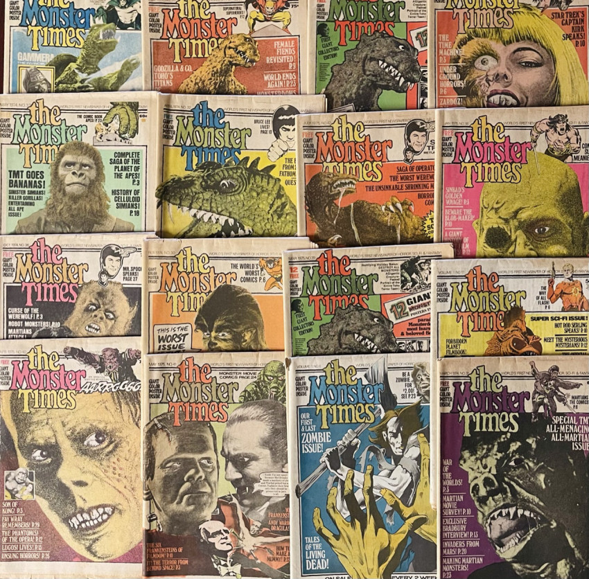 [NEWSPRINT POSTERS] A collection of 17 issues of The Monster Times, 1973-5, a pulp magazine focused on, well, monsters and far-out creatures found in pop culture of all kinds. Printed on newspaper stock, partially in color, the issues opened to full length “center fold” posters, meant to be ripped out and tacked to a kid’s wall. All issues are complete. The lot includes the “Sci-Fi Super TV Special” titled “Star Trek Lives” boasting six color portraits. General condition is acceptable, some stress to folds, toning, minor chipping.