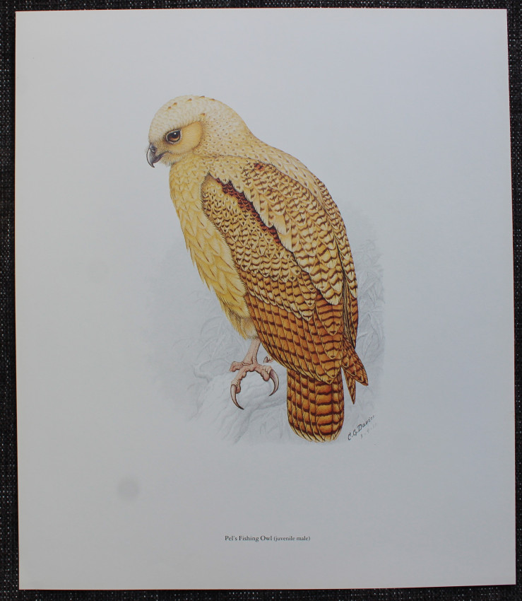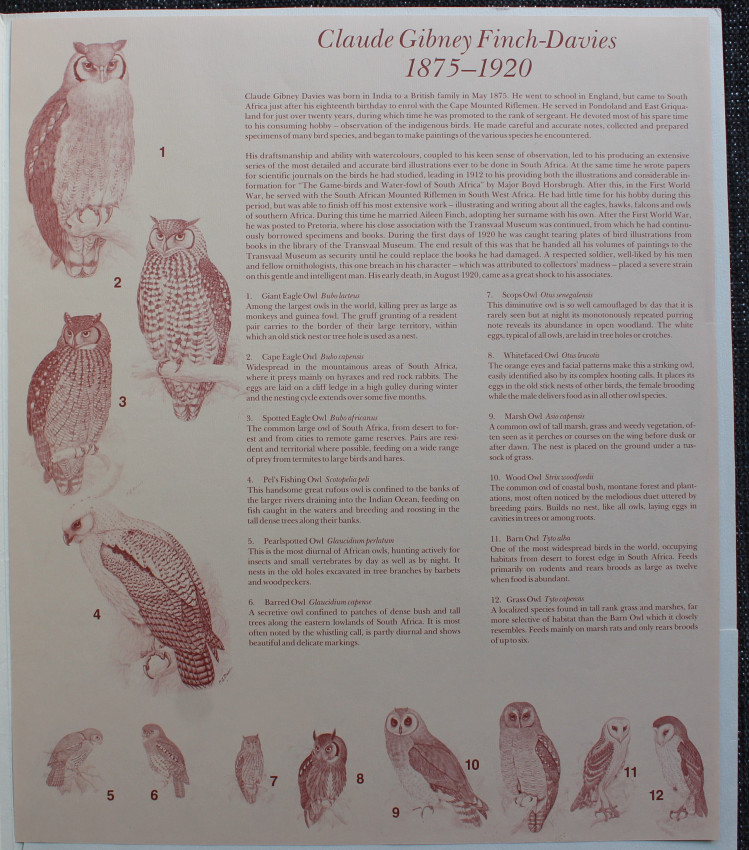 Twelve owls are listed and described - 1 Giant Eagle Owl, 2 Cape Eagle-Owl, 3 Spotted Eagle-Owl, 4 Pel's Fishing Owl, 5 Pearl-spotted Owl, 6 Barred Owl, 7 Scops Owl, 8 White-faced Owl, 9 African Marsh Owl, 10 Wood Owl, 11 Barn Owl, 12 Grass Owl.
