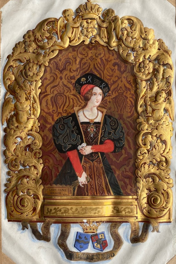 Portrait of Lady Jane Gray, liquid gold and body-color on vellum, with integral lettering ‘Ye Lady Jane / Graye [sic.]/ 1553 / Lady Jane / Gray d’apres … / l’original de / Holbein [sic.] / Emma Roberts’. [Great Britain?: undated but circa 1830-1860]. Liquid gold and body-color on vellum (visible area: 9 3/8 x 6 1/8in; 237 x 155mm), vellum stretched ‘flat’ using gummed brown paper [see images]. (Some slight chipping of liquid gold, some cockling to vellum). Framed.