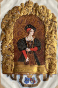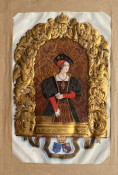 An attractive re-interpretation of Holbein’s original: a contemporary lithographed version noted that (in about 1840) the “original of this picture, by Hans Holbein, is to be found in the Collection of Coll. Elliott of Nottingham.” Lady Jane Dudley (née Grey) (1537 - 1554) was the grand-daughter of Henry VIII's sister Princess Mary, and in 1533 married Lord Guildford Dudley, son of the Duke of Northumberland. Acting under the influence of Northumberland, the young and ailing King Edward VI willed her the crown. She was proclaimed queen at his death in 1533, but reigned only briefly until she was captured by supporters of Mary Tudor. She was subsequently executed.