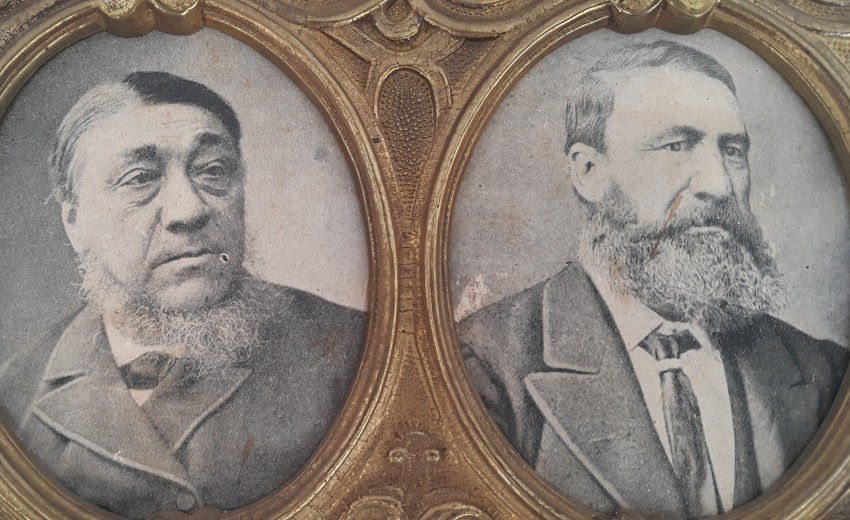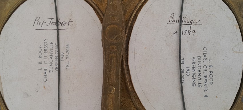 Framed portraits of Paul Kruger in 1884 and Piet Joubert, (10 x 8 cm.), reproduced by L.B. Roodt of Vereeniging in 1930.