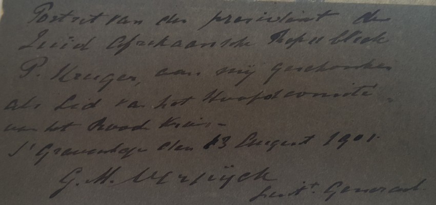 "Portret van den President de Zuid Afrikaanshe Republiek, P. Kruger aan my gesekondeer als lid van het hoof komite van het Roode Kruis den 13 Aug. 1901."
