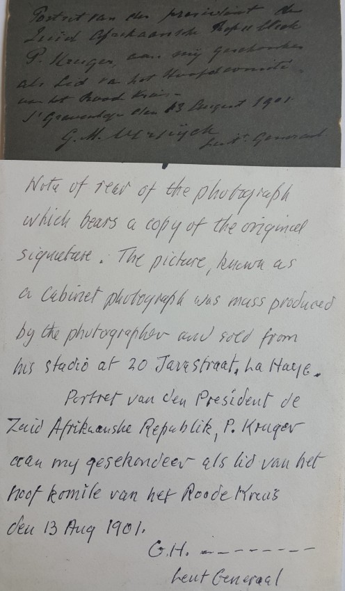 Also a cabinet photograph of Paul Kruger, (14.5 x 9.5 cm.), printed in Holland and bearing a copy of Paul Kruger's signature. Written on the back of the photograph: