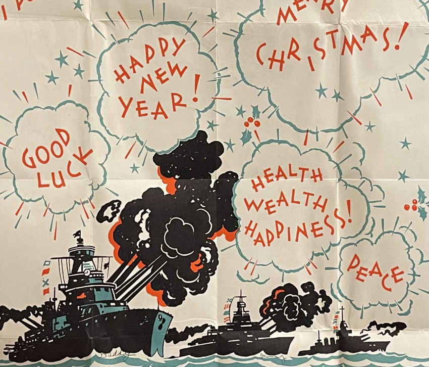 ”Coming Across With My Christmas Greetings” folded card that opens to a large poster, each section double the size. Signed "L.M.” Comic, naval themed American history— from Columbus to WWII. A few names written on the poster.