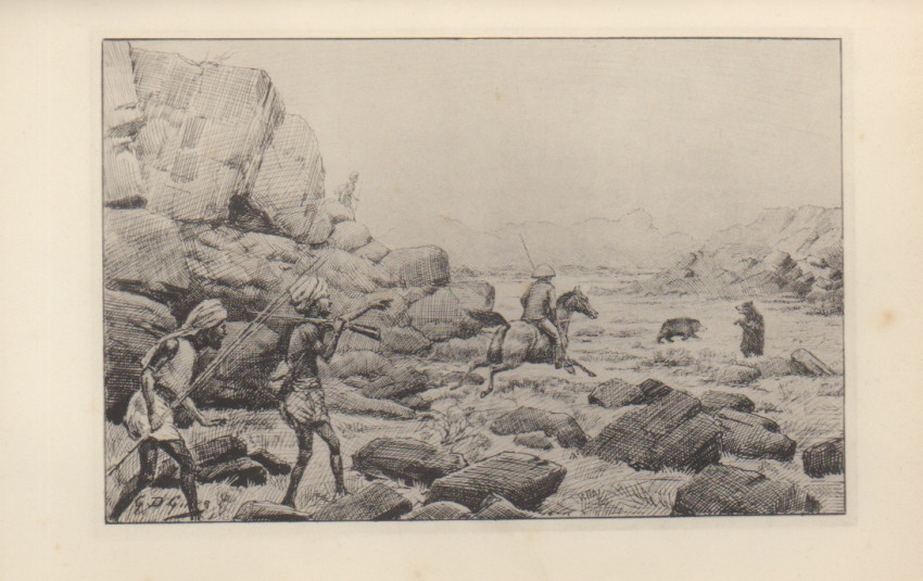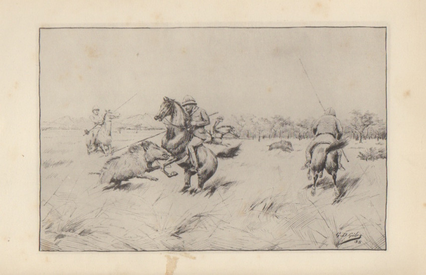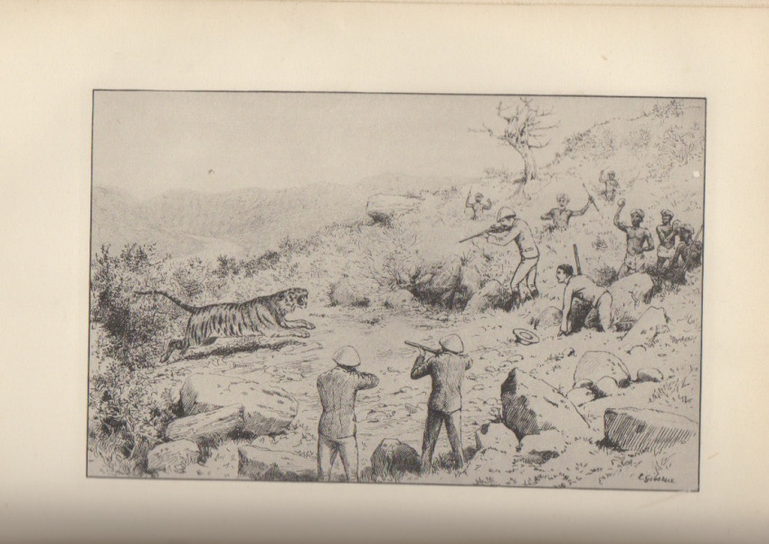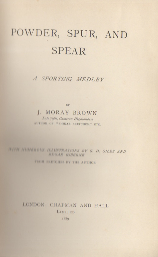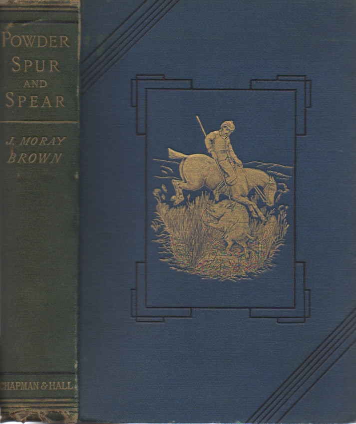 This work recalls Brown's love of equestrian sports, bird shooting and salmon angling as well as big game hunting in India after panther and tiger. There is also a description of pig sticking near the Nagpore Station in the Deccan, and an encounter with an elusive barasingh in Kashmir. In addition, the author details bear hunting with a spear. Original gilt pictorial blue cloth with pig sticking vignette on upper board and gilt spine titles. Original green endpapers starting at the inner hinges. Cloth rubbed, spine ends a little frayed.