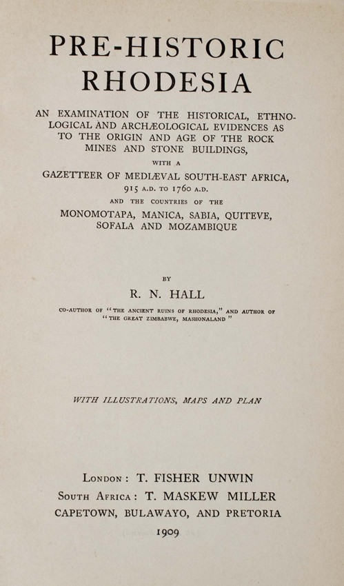 Pre-historic Rhodesia: an examination of the historical, ethnological and archaeological evidences as to the origin and age of the rock mines and stone buildings, with a gazetteer of Medieval South-East Africa, 915 A.D. to 1760 A.D. and the countries of Monomotapa, Manica, Sabia, Quiteve, Sofala and Mozambique "The Author presents the first installment of a reply to the conclusions of Dr Randall Maciver concerning the Origin and Age of the Rhodesian Rock Mines and Buildings" (Preface).