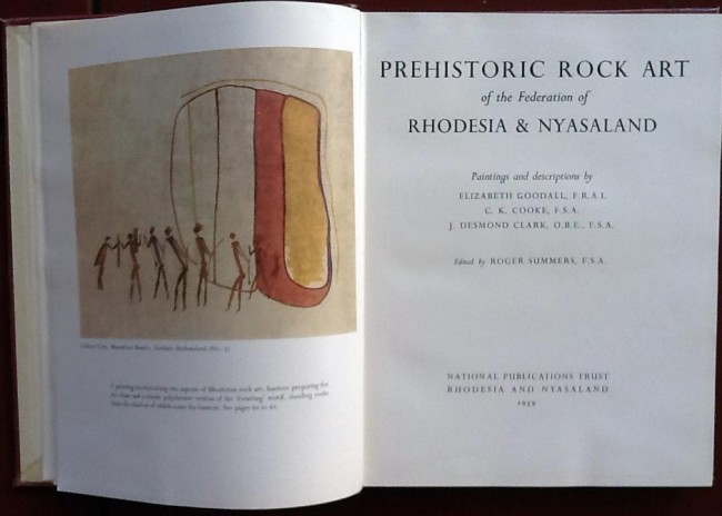 267p. Full colour plates, figures. Red cloth boards with gilt lettering to spine. Has been covered with plastic. Previous owner's name on ffep. Detailed description of paintings and engravings in Rhodesia and Nyasaland.