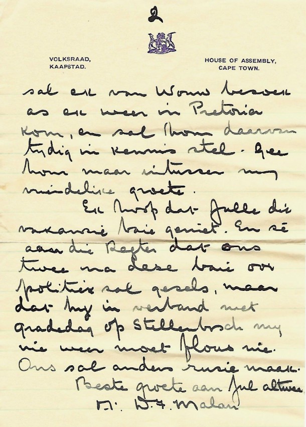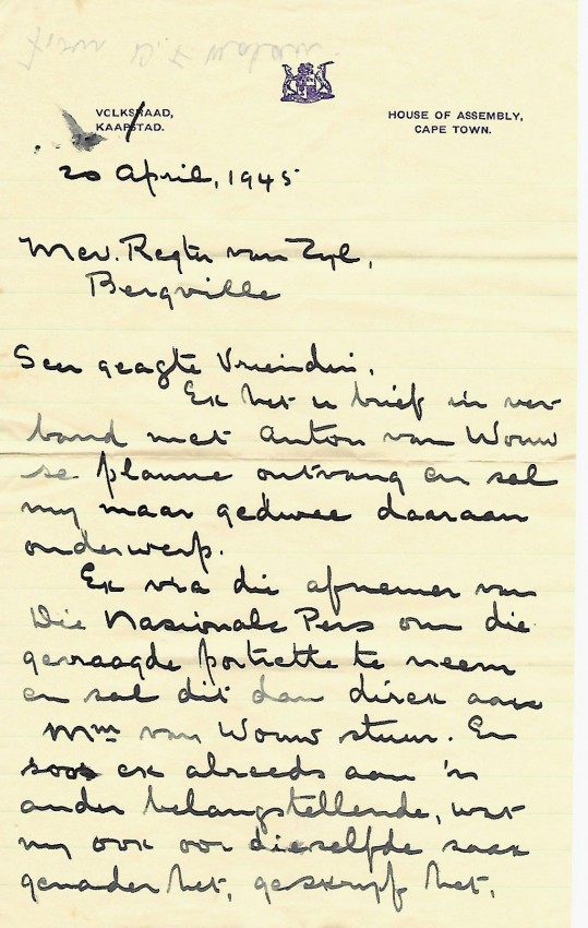 2pp. als by D.F. Malan in Afrikaans addressed to Mev. Regter Van Zyl, (Elizabeth Van Zyl nee. Reitz - O.F.S. President F.W. Reitz's daughter), on House of Assembly letterhead, dated 20 April, 1945. The letter concerns a portrait photograph of Malan which sculptor Anton Van Wouw had requested, almost certainly with a view to his making a Bust of Malan. It also deals with some personal matters and his interest in having a chat about political matters with the Judge (her husband). As Van Wouw died in July 1945, the Malan sculpture was obviously never done or completed.