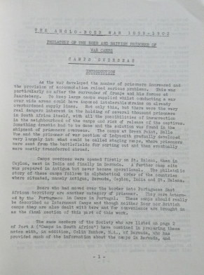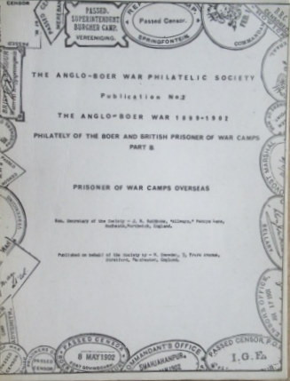 Philately of the Boer and British Prisoner of War Camps. PART A. Prisoner of War Camps in South Africa and The Burgher Camps. 80 pages text with some examples of postmarks and cancellations.