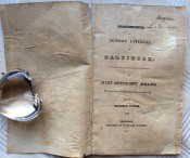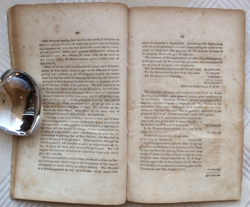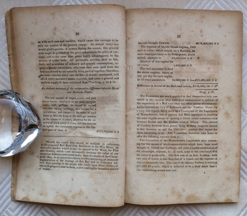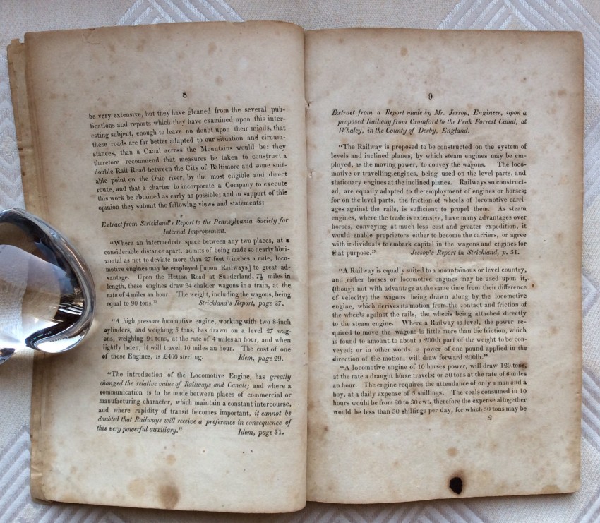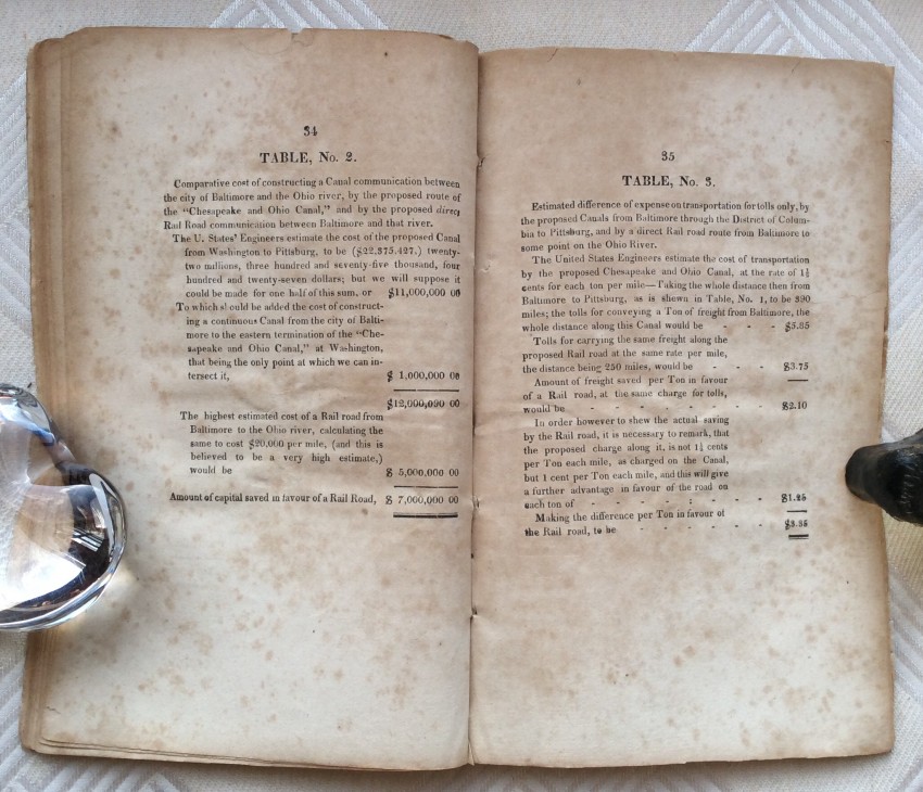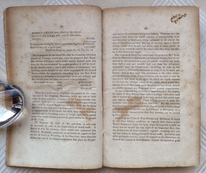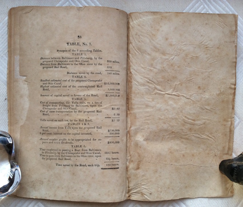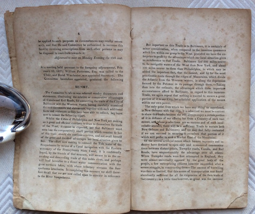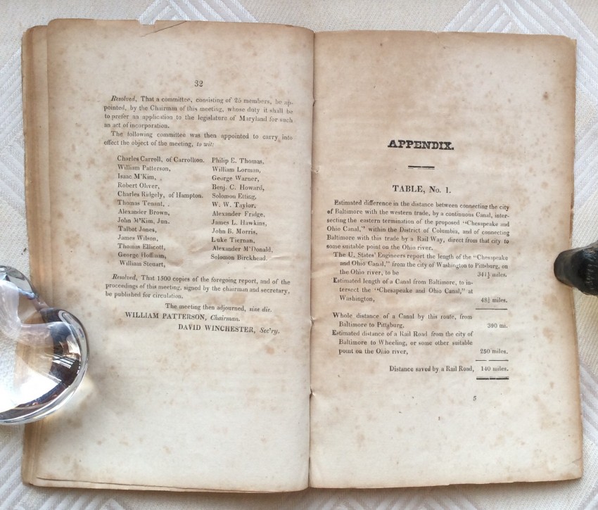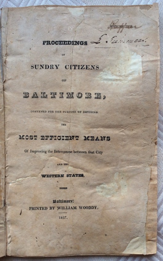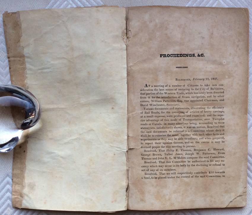 A poor copy of a rare pamphlet recording the meeting that resulted in the formation of the Baltimore and Ohio R. R. Co.: the last copy listed as having sold at auction sold for $100 in 1969, and there is currently only one other (nicer) copy for sale (at $750).