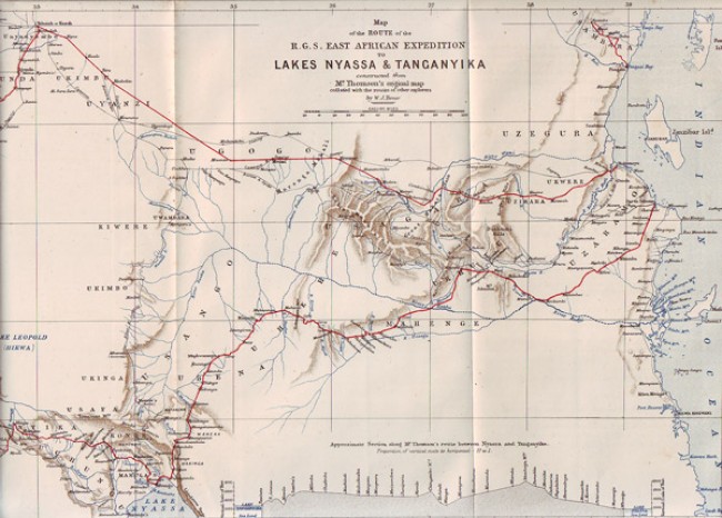 Preliminary report by Thomson on the explorer\'s journey to Lakes Nyassa and Tanganyika,1880, pp 721-742 plus folding map in colour; as well as Stewart\'s \"Lake Nyassa and the Water-route to the Lake Regions of Africa\", 1881, pp 258-277 plus folding map in colour. Bound in brown buckram, good condition except for light sporadic foxing