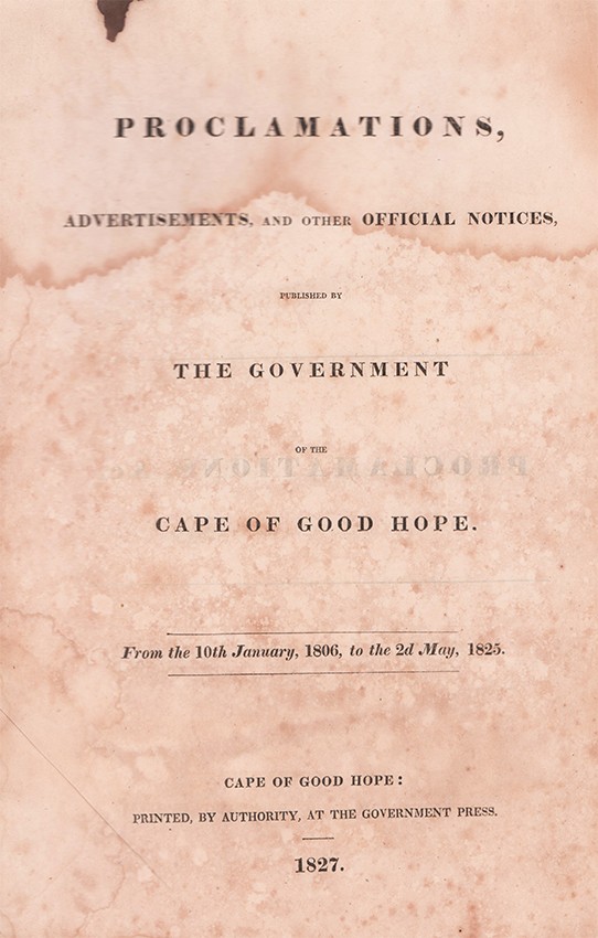 Proclamations formally declare to the general public that the government has acted in a particular way. These were issued by the Governor of the Cape from 1806 - 1825.