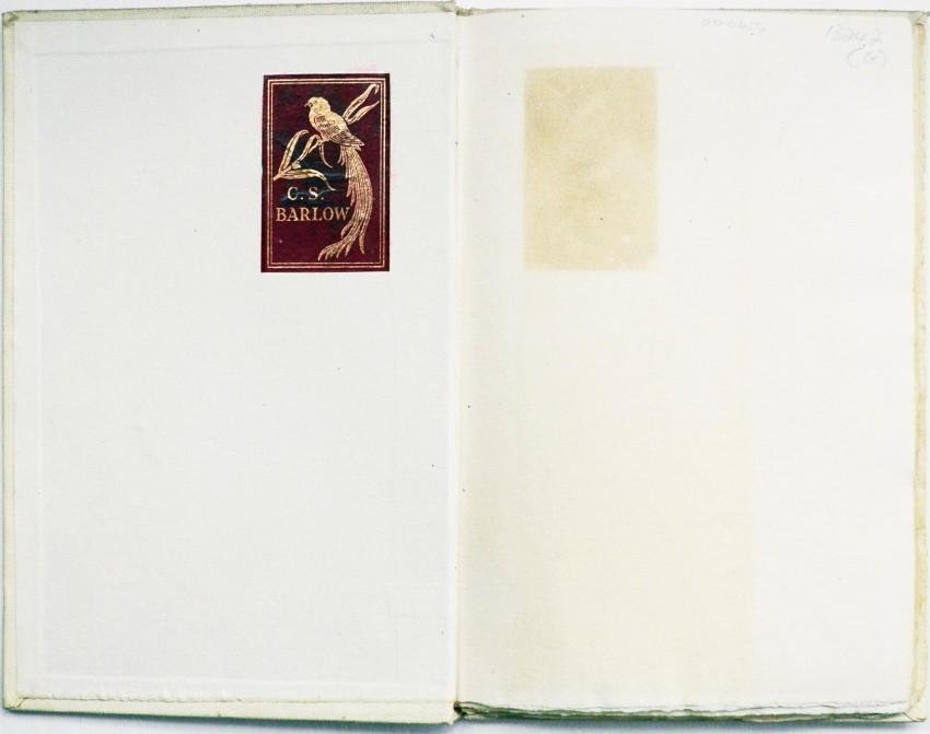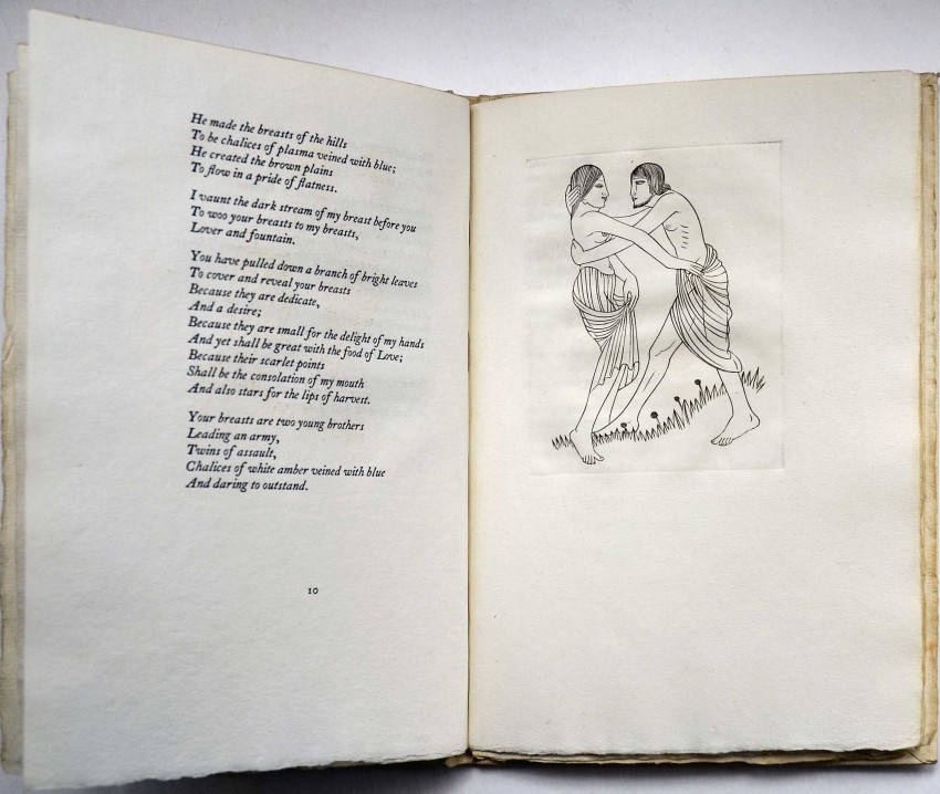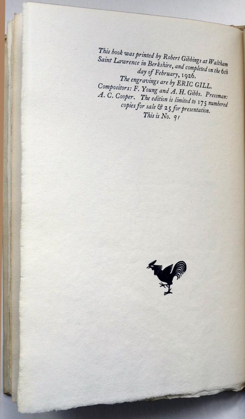 This scarce and desirable Golden Cockerel Press and Eric Gill book is one of only 175 copies of which this is number 91. In the original cream cloth binding which has a few light stains. From the prestigious library of C.S.(Punch) Barlow, the well known South African industrialist and bearing his small red leather bookplate at the top of the front pastedown. This has left an offset mark on the next 2 blank leaves. Apart from this the book is internally clean, unmarked and without foxing. Lacking the slipcase. Contains five exquisite erotic engravings by Gill.