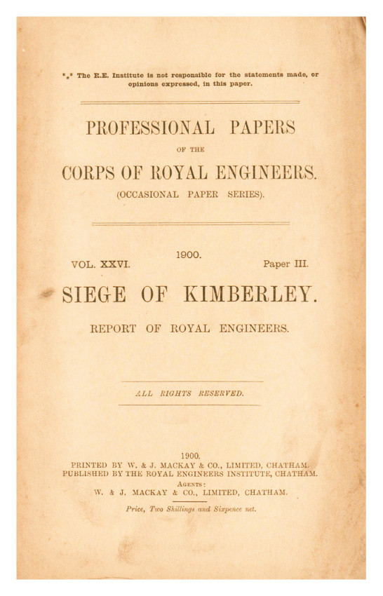 24 pages plus 16 folding plates (including a large folding plan of the Defence of Kimberley, engineering plans and diagrams), light brown card wrappers – paperback, which are worn, a very good copy.