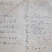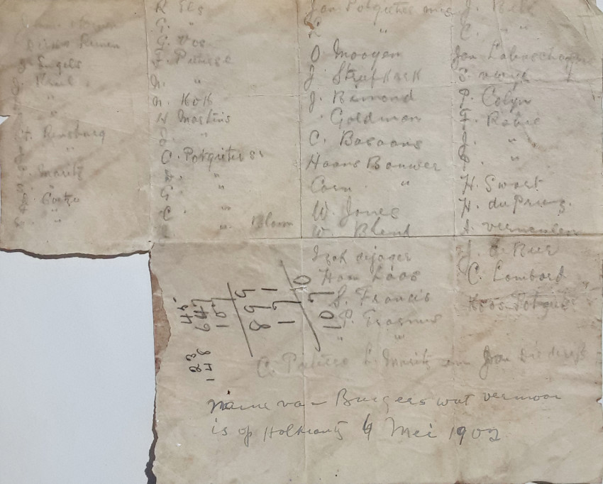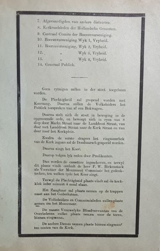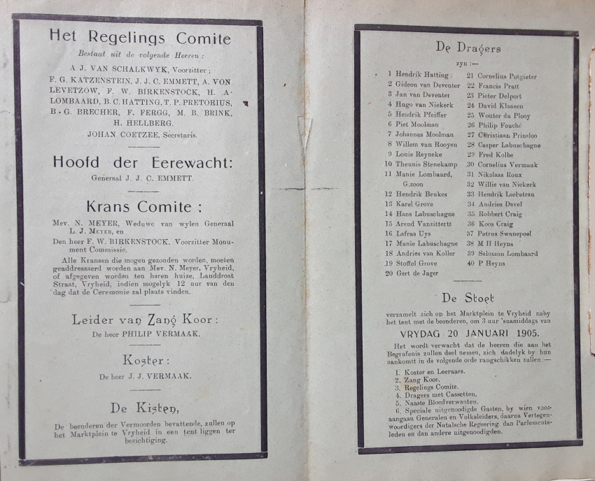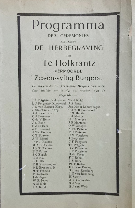 Lot of 2 items pertaining to the Battle of Holkrantz (Holkrans). (1) Four page leaflet (size 22x14cm) issued for the re-burial of 56 Boer Burgers at Vryheid on 20 January 1905. It features the names if the murdered burgers, the Organising Committee, coffin bearers, processions and protocol of the day etc. (2) The program comes with a hand-written note in pencil which features the list of murdered burgers. The note was probably compiled during the war. Both items are from a collection of the Birkenstock family. (See LOTS 439, 441, 444, 445). F.W. Birkenstock served as chairman of the Monuments Commission during the re-burial.
