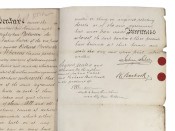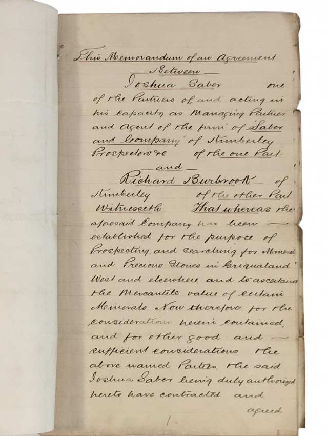 Six foolscap leaves (including cover sheet, double ruled in red) secured with a green ribbon, being the agreement by Joshua Saber to employ Richard Burbrook to prospect for the company. Four horizontal folds, first four leaves with writing on the recto only, fifth leaf signed by Burbrook, Saber and two witnesses on the recto and on the verso is an indenture dated the 6th of December, 1882, releasing Saber and Burbrook from all claims. Signed by both on the recto of the last leaf in the presence of R. Burdon, clerk to Mssrs. Lewis and Lewis of Ely Hall, Holborn. On the verso of the last leaf is a pencil note: “Kimberley. Prospecting for precious stones and Minerals S. Africa 1881”. Comes with previous bill of sale from Roger J. Knowles to previous owner, dated 19th September, 2010.