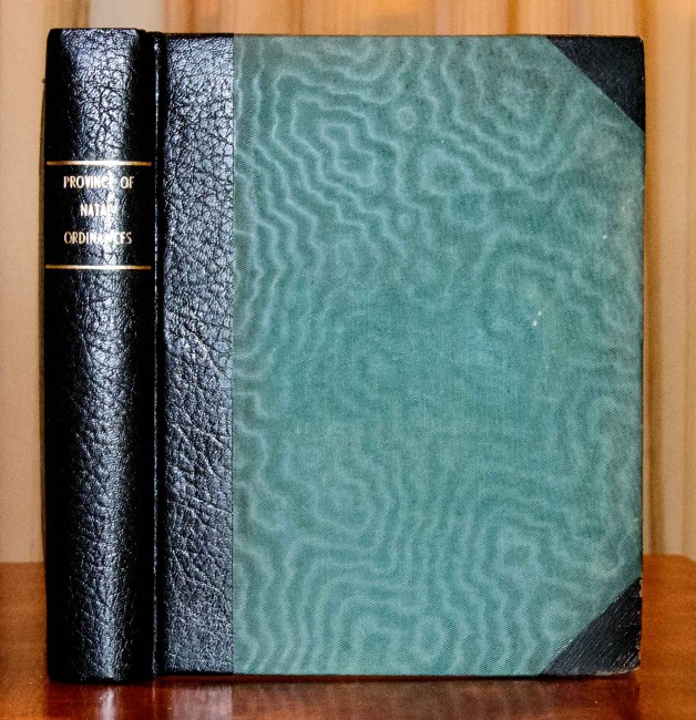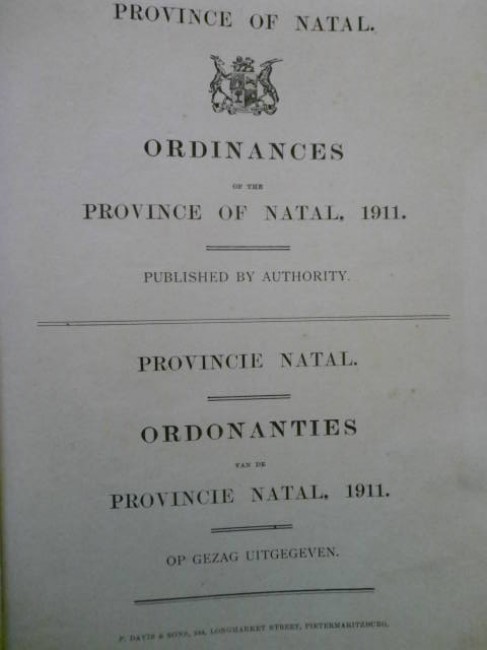 In English and Dutch on opposite pages, the ordinances of the Natal Province for the first 10 years of Union are complete and bound in this single volume, with each year paginated separately - 69 + 65 + 71 + 51 + 33 + 109 + 55 + 74 + 81 + 145 pp, making the total including year dividers well over 750 pp.