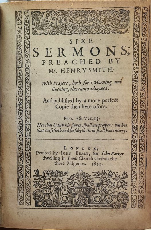 Smith Henry. Sixe Sermons Preached by Mr. Henry Smith: With Prayers Both for Morning and Euening Thereunto Adioyned. and Published by a More Perfect Copie Then Heretofore. Printed by Iohn Beale for Iohn Parker Dwelling in Pauls Church Yard at the Three Pidgeons 1621.