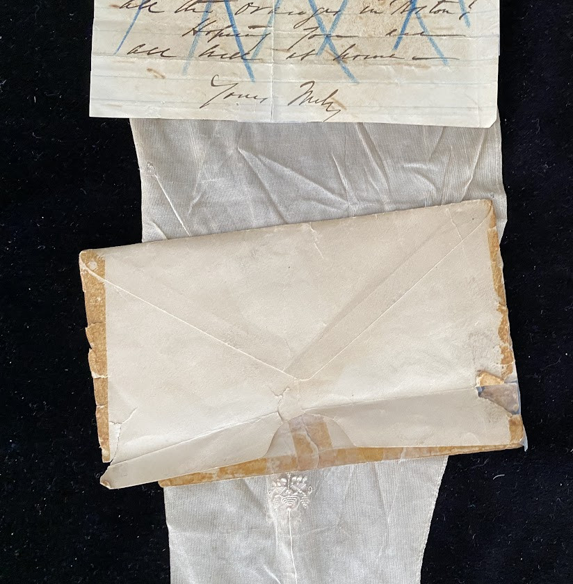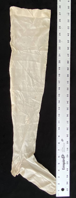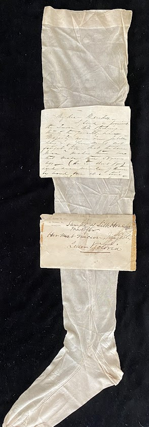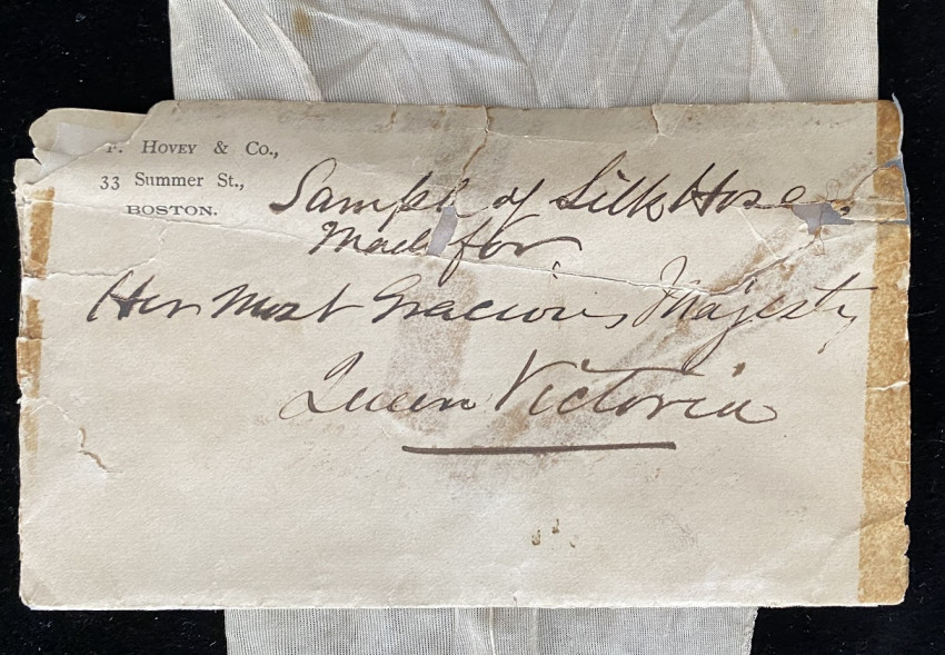 Queen VICTORIA. – C.F. HOVEY & Co.] A sample silk stocking (28 inches long), with accompanying autograph material (a partial letter ‘I send as promised the Queen’s silk stocking’ [probably 1887] and associated C.F. Hovey & Co. envelope ‘Sample of Silk Hose made for her Most Gracious Majesty Queen Victoria’).