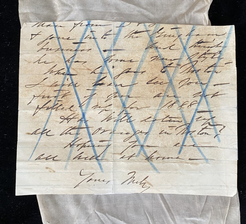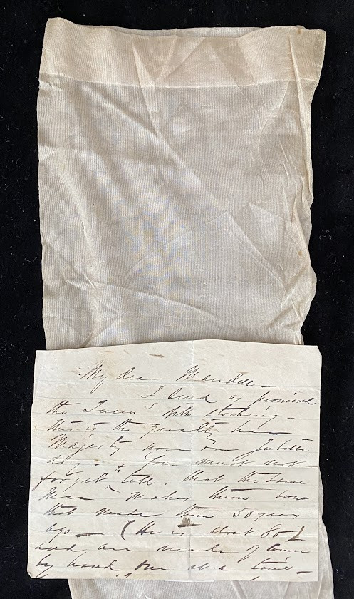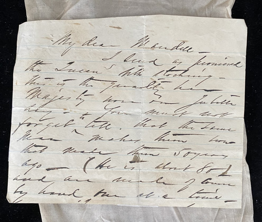 The partial letter, from an unidentified correspondent, reads “My dear Mandell / I send as promised / the Queen’s silk stocking - / this is the quality Her / Majesty wore on Jubilee / day – you must not / forget to tell that the same / man makes then now / that made them 50 years / ago (He is about 80) and are made of course by hand one at a time”.