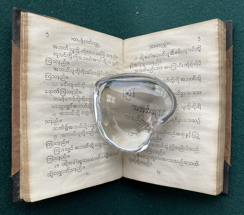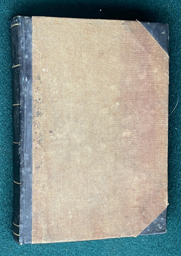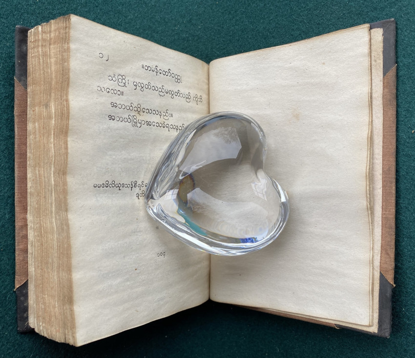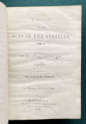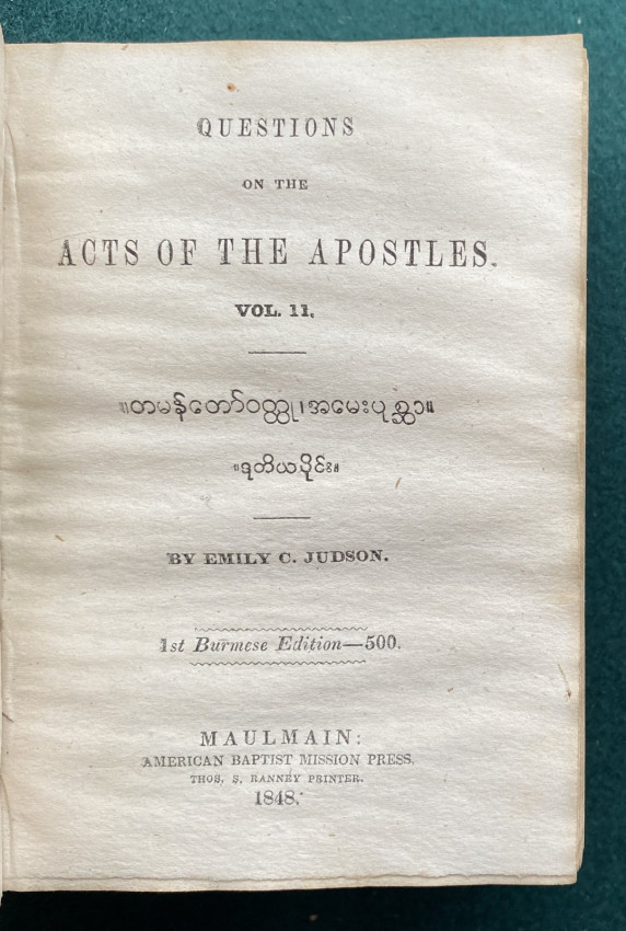 Questions on the Acts of the Apostles... By Sarah A. Judson. 1st Burmese Edition - 500. "Maulmain" [i.e. Mawlamyine, Myanmar]: American Baptist Mission Press, Thos. S. Ranney printer, 1848. 2 volumes in one, small octavo (5 3/8 x 3 3/4in; 136 x 95mm). Titles in western and burmese script, text in burmese script throughout. (Some waviness to paper, otherwise excellent). Contemporary half black/dark blue leather over cloth-covered boards, spine ruled in gilt (covers and endpapers affected by damp [see images]). Provenance: Nashua Historical Society, NH (inscription, noting the May 1873 gift of the book by Mrs. S. Noyes).