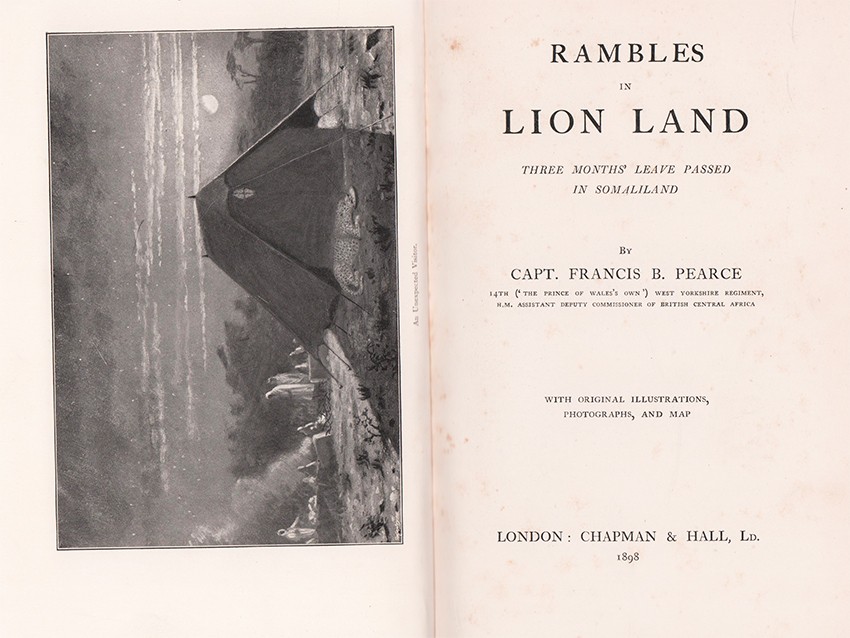 Czech: An Annotated Bibliography of African Big Game hunting Books, 1785 to 1999, pages 214 - 5. 'The author, an assistant deputy commissioner of British Central Africa, pursued sporting adventures in the Haud region west of Hargeisa in Somaliland. After travelling by camel caravan, he and his hunting party bagged oryx and aoul, plus records of numerous encounters with lion. Continuing into the interior, elephants were collected. Near the Ethiopian border and the Tyuli Hills, rhinoceros, kudu and leopard were hunted.'