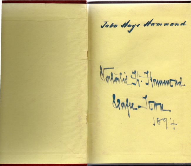 This was John Hays Hammond's - and later Natalie H Hammond's - copy. John Hays Hammond was the author of The Truth About the Jameson Raid and other books.