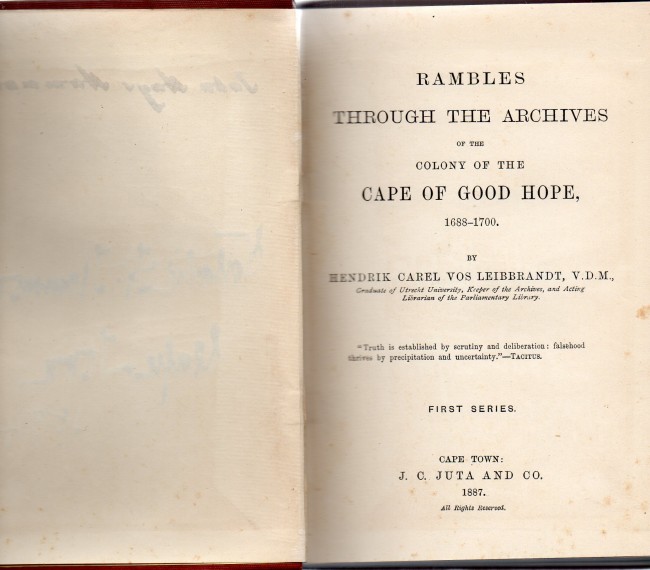 Leibbrandt dedicated his book to the Colonial Secretary of the Cape, John Tudhope. His survey begins with the appointment of Willem Adriaan van der Stel as governor of the Cape in succession to his father, Simon, and ends, nineteen chapters and a few years later, with the announcement of a bumper wool crop and the belief that this could be exported.