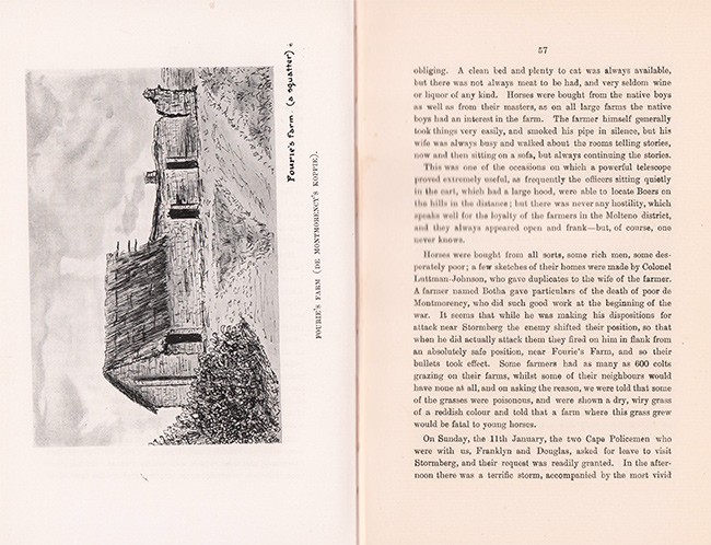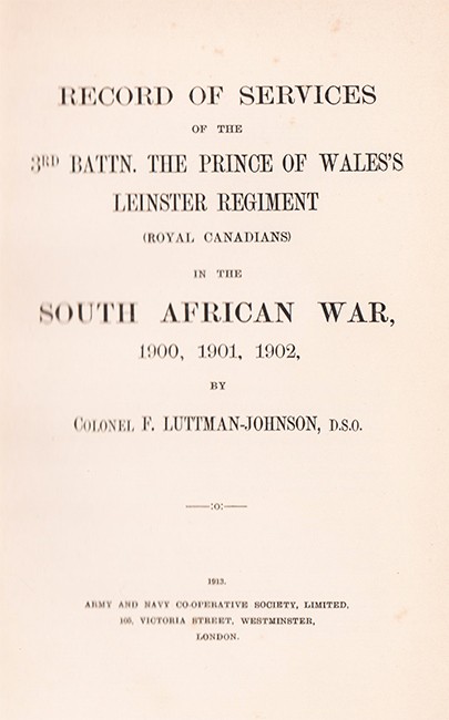 Hackett (R.G.) South African War Books, page 95. ‘The record of a militia battalion in South Africa based on regimental records, the author's campaign diary and other sources. The 3rd Leinsters arrived at East London in April 1900. They were first based at Queenstown in eastern Cape Colony before moving north to Stormberg where they were stationed for nine months. A detachment was posted to Aliwal North near the Orange Free State border. In late April 1901 the Leinsters regrouped at Stormberg and entrained for Kimberley where they stayed eight months primarily employed in blockhouse duties north and south of the town. A detachment joined the Kimberley Column, a local mounted force commanded by Col. Paris, and a company of Mounted Infantry was organized. The Column took part in convoy operations to Boshof in May 1900 and, in August of that year, was engaged by a Boer force at Wolvenkuil. In December the regiment was ordered to Modder River to reinforce the garrison. To the conclusion of active service, in April 1902, the 3rd Batt. engaged in blockhouse duties between Spytfontein and Honeynestkloof. Appendices include extracts from the author's diary, an account of the battle of Stormberg and notes on the early history of the Regiment.