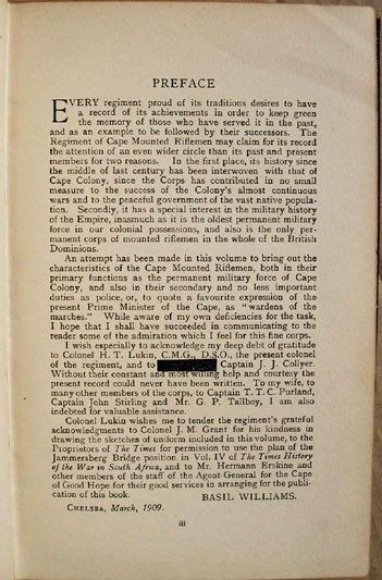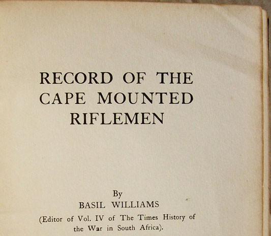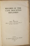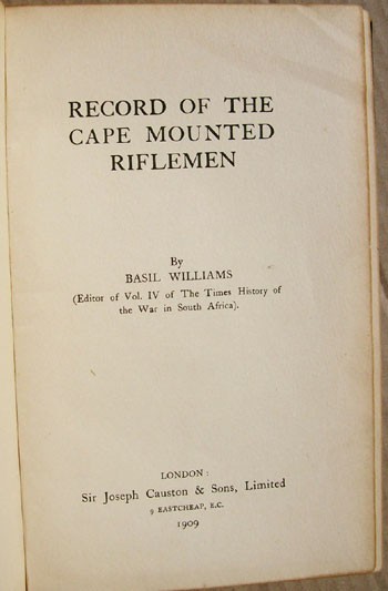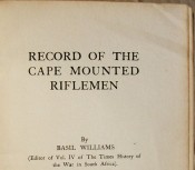 The text has various rolls of Cape Mounted Riflemen who were killed or died of wounds or disease in the Anglo -Boer War, lists of those awarded commissions, etc. Appendix A has lists of officers and Appendix B has a list of Decorations, including the six recipients of the Victoria Cross.