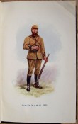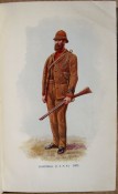 Original black binding with gilt titling on the spine and regimental decorations on the upper board. 6 prelims, 138 pages, eleven full page plates as called for: A black and white plate of Moirosi's Mountain and 10 colour plates of soldiers in uniform with tissue guards and a coloured fold out map of the Siege of Wepener.