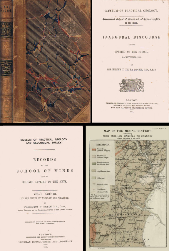 Separates of all 7 papers published in the vol. 1 bound together.: Inaugural and introductory lectures to the courses for the session 1851-2 + vol. 1 part 3: Smyth W.W. - On the mines of Wicklow and Wexford (all bound together) In 8vo, half leather with gilt lettering on spine (scraped), pp. 24+16+29+27+25+19+24+(18); 349-409+12+8 with 3 pls. Papers are: De La Beche H.T. - Inaugural discourse to the opening of the school; Forbes E. - The relations of natural history to geology and the arts; Plyfair K. - On the national importance of studying abstract science with a view to the healthy progress of industry; Smyth W.W. - On the value of an extended knowledge of mineralogy and the processes of mining; Percy J. - On the importance of special scientific knowledge to the practical metallurgist; Hunt R. - On the importance of cultivating habits of observation; Ramsay A.C. - On the science of geology and its applications