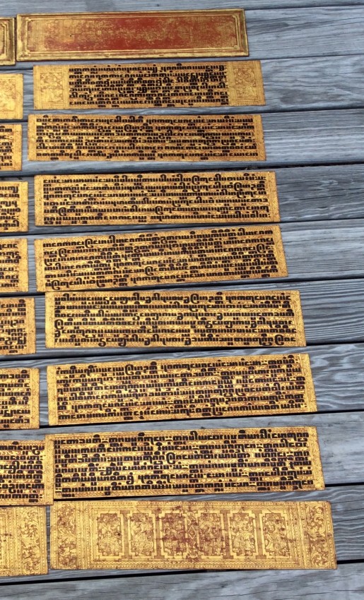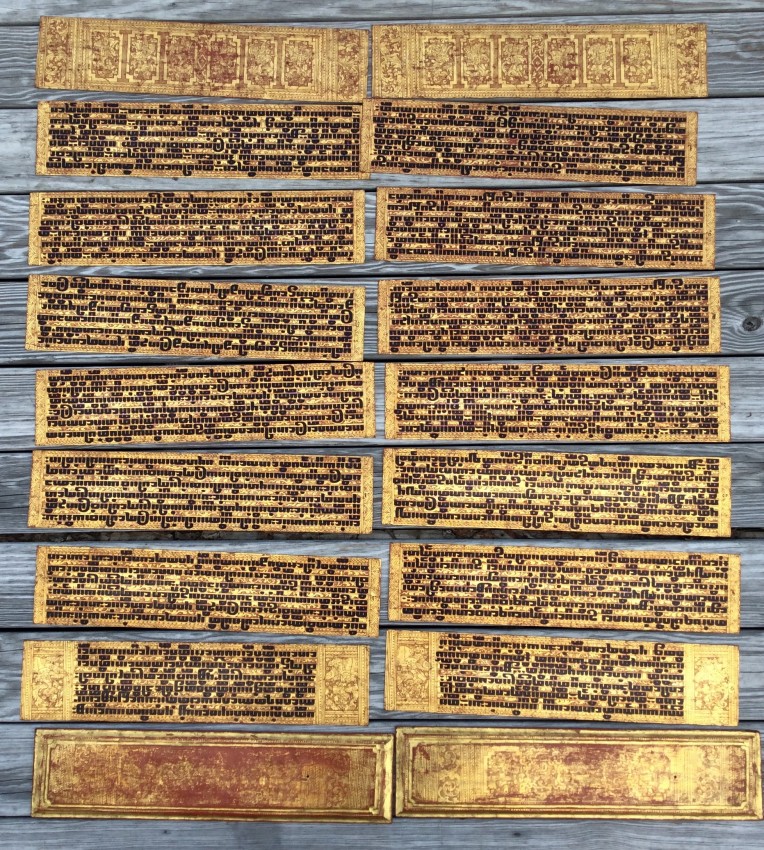[Burma: early 20th century]. 16 leaves (4 7/8 x 22 inches), each lacquered in red with elaborate overall decoration in gilt, 14 leaves with lines of black/dark brown lacquer text in square script (known as 'magyi-zi) recto and verso, two leaves with text on one side only, the other with an overall decoration in gilt.