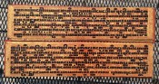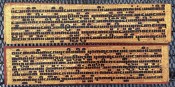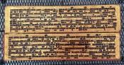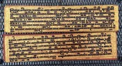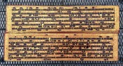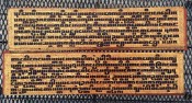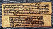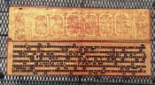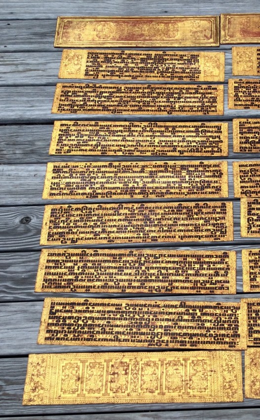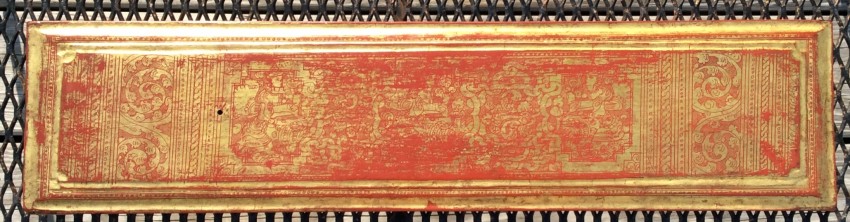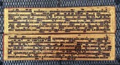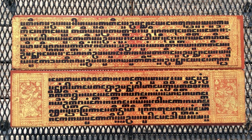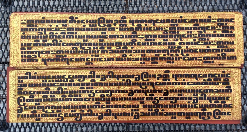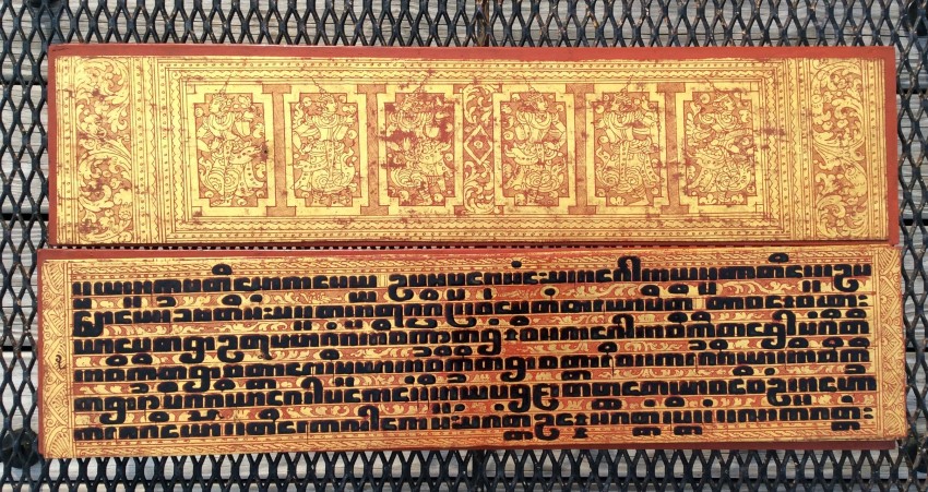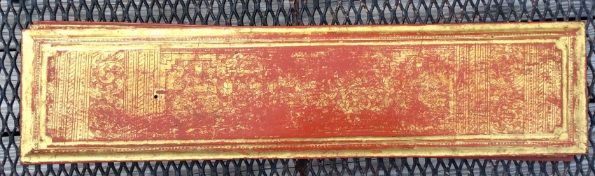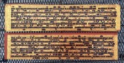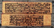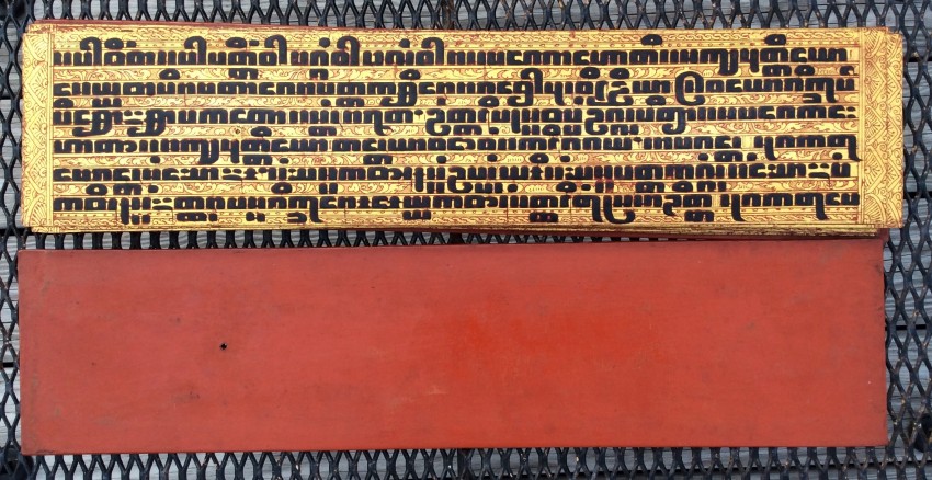 "In the 17th century, folios began to be made of pieces of cloth coated with lacquer and painted with cinnabar, and the square letters were written in thick, black lacquer. On rare occasions, folios were of ivory. Designs in gilt, which had been reserved for the ends of folios, end papers, and wooden coverboards, now began to appear between the lines of text. By the end of the 19th century, the lines of script on the folio increased to six or seven and sheets of brass or copper were introduced as folios" (John Falconer, and others, 'Myanmar Style Art, Architecture and Design of Burma', Hong Kong, 1998, p. 177).