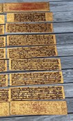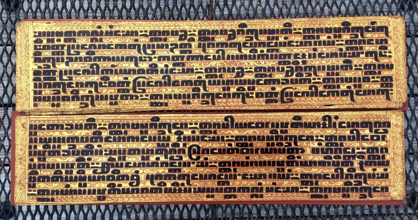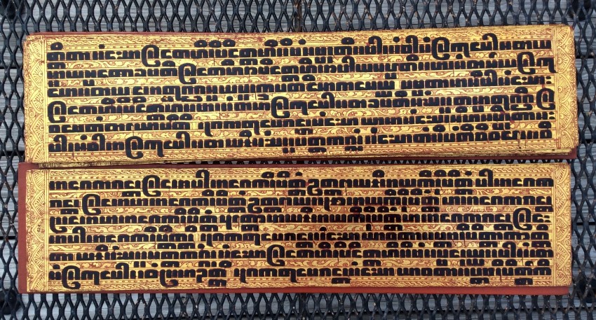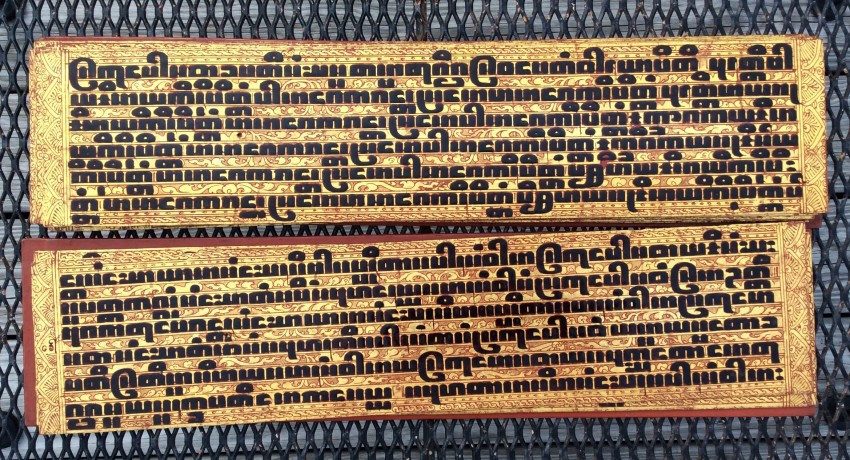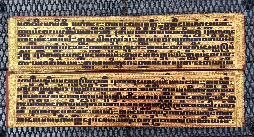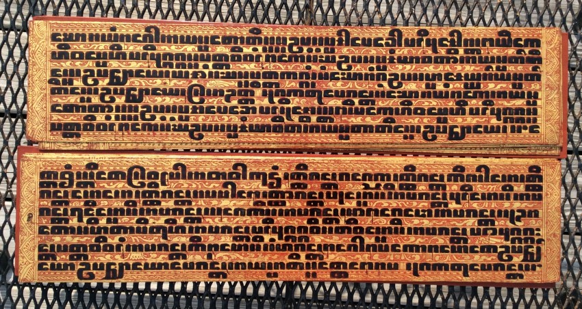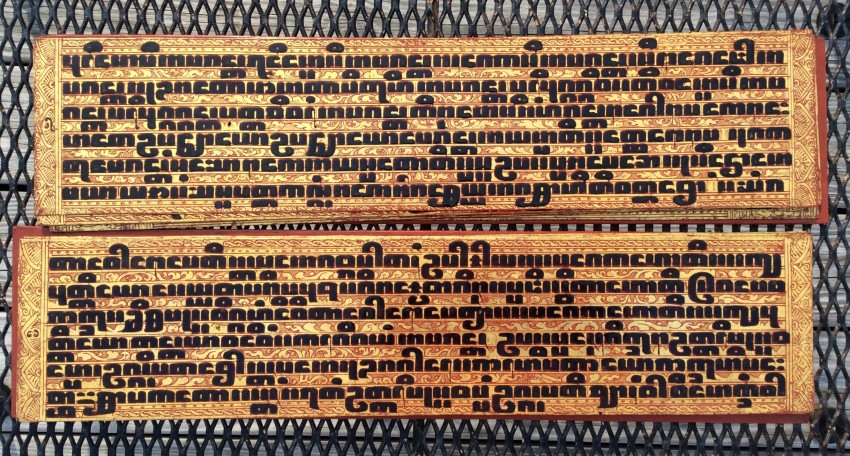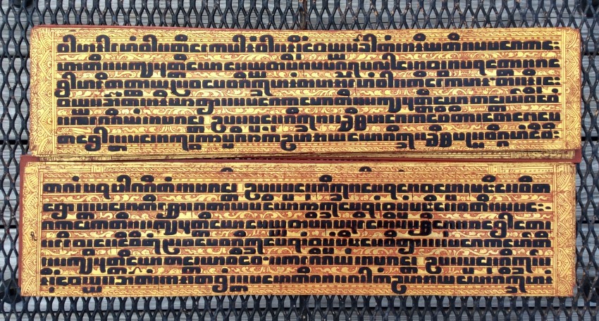 Relating to rituals of ordination and monastic life, the Kammavaca (a Pali term) describes selected verses from the Tipitaka. "Kammavaca are volumes of one, five, or nine extracts from the Theravadin Vinaya, each relating to specific ceremonies associated with monks. Noel F. Singer writes that the earliest kammavaca consisted of folios made of plain palm leaves, each of which had four lines of square-inked script on a gold or silver background." ("Kammavaca Texts: Their Covers and Binding Ribbons," Arts of Asia, 23, May-June 1993).