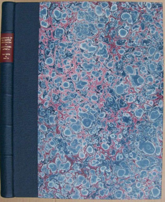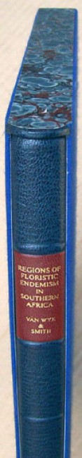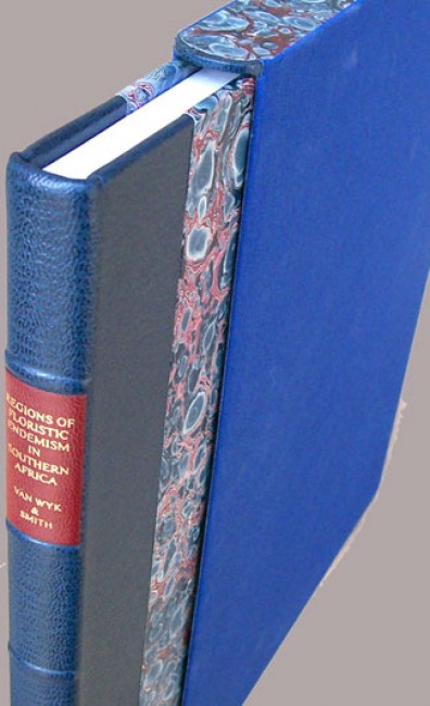 Original dark blue leather spine with a red title label and marbled paper covered boards matching the trim of the slip- case. Bound by master craftsman Peter Carstens.