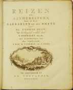The Dutch translation of Dr Shaw’s second expanded edition of his Travels in Barbary and the Levant published in 1757. The author travelled from the Levant to Tunis and Algeria. A botanical section describes more than six hundred and forty species.