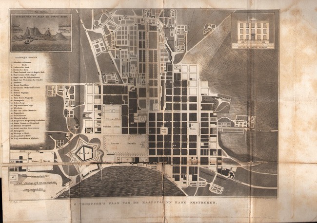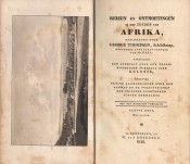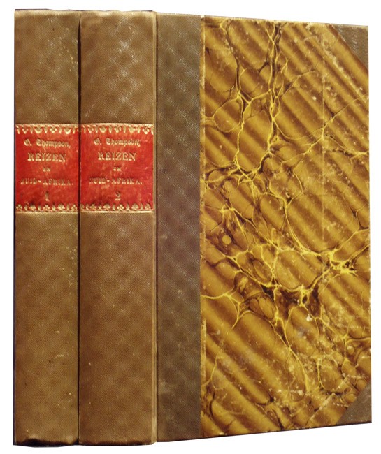 2 volumes, I. xx, (ii), 439. II. x, 457 pages, aquatint frontispiece in each volume, 7 aquatint plates, folding plan of Cape Town – torn along the bottom fold, large folding map at the end of volume II – repaired along outer margin, old half brown cloth the red title labels on the spines, marbled paper sides, light foxing and browning of the text.