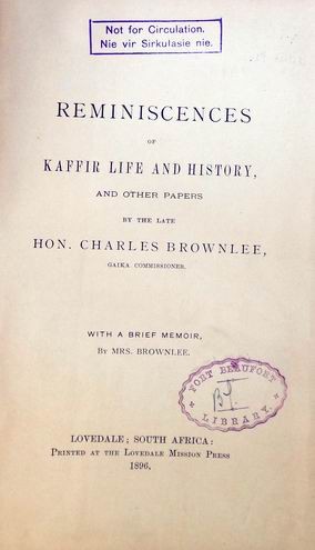 A hardcover Octavo, ex library copy in its original dark green cloth covers with gilt titles and a decorative band in black to the front and spine. A sketch of the life and experiences of Honourable Charles Brownlee. He is generally accepted as having had an encyclopedic knowledge of of the lives and administration of Native Affairs. Eight preliminary plus 398 pages of text. Condition good but with shelf wear to the bottom boards and spine and spine. The book has the usual library stamps to the front few pages and there is some staining to the front cover.