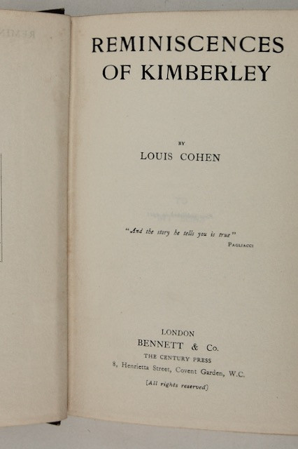 Reminiscences of Kimberley. London: Bennett, 1911. First edition (pp. ix, 436). Octavo (19 cm) in publisher’s purple cloth, gilt titles. Quite a scarce title— Cohen’s recollections, whether true or not, did not reflect favourably on the local establishment some members of which successfully sued him, at great cost to the author and detriment to the available supply of the Reminiscences on the market. This surviving copy is but lightly abraded at the head and tail of the spine, spine is sun-faded, a few spots to front cover; otherwise clean, bright, and sound. Scarce, for the reasons stated.