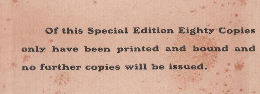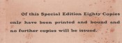 This copy has a printed slip tipped in on the front free end paper: Of this Special Edition Eighty Copies only have been printed and bound and no further copies will be issued.