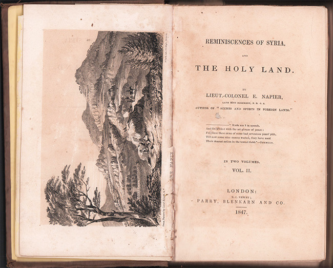 When the British fleet was engaged on the coast of Syria in 1840, Napier was sent out with the local rank of lieutenant-colonel and assistant adjutant-general. For his services in Syria and Egypt he was made brevet lieutenant-colonel from 31 Dec. 1841, and received the Syrian medal and a gold medal from the Sultan. Being reported medically unfit to accompany his regiment to the West Indies, he retired on half-pay unattached in 1843, and afterwards resided some time in Portugal. In 1846 he was sent to the Cape with other special service field officers to organise the native levies, and commanded bodies of irregulars during the Kaffir war of 1846–7. He died at Westhill, Shanklin, Isle of Wight, on 19 June 1870, aged 63. Napier was a man of literary and artistic ability, and a frequent and very practical writer in the public press and elsewhere on professional topics. Besides contributing to the magazines, chiefly ‘Bailey's’ and the ‘United Service Magazine,’ for over twenty years, he was author of the following works: 1. ‘Scenes and Sports in Foreign Lands,’ 2 vols. 1840. 2. ‘Excursions on the Shores of the Mediterranean,’ 2 vols. 1842. 3. ‘Reminiscences of Syria,’ 1843. 4. ‘Wild Sports in Europe, Asia, and Africa,’ 1844. 5. ‘Excursions in South Africa, including a History of the Cape Colony’ (‘Book of the Cape’), 1849. 6. ‘Life and Correspondence of Admiral Sir Charles Napier,’ 1862.