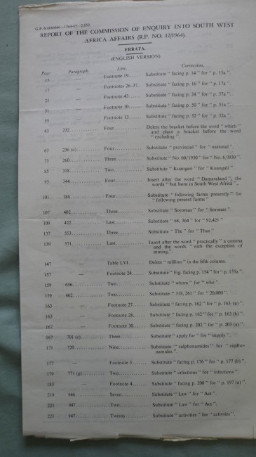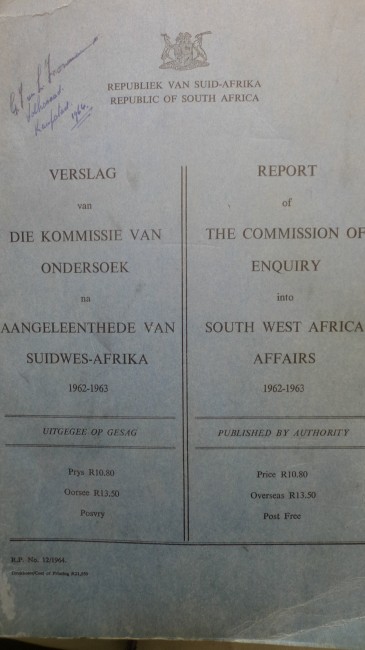 Regardless of the intentions of the government of the day and the subsequent constitutional changes, this document remains an essential and authoritative source-book for the present Namibia, researched and written as it was by as fine a team as one could expect - some of the leading authorities of the day in their various fields, - and all, except for the chairman, doctors and/or professors: H J van Eck, H W Snyman, J P van S Bruwer, P J Quinn (members) and C J Claassen (secretary).