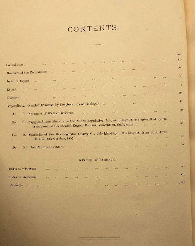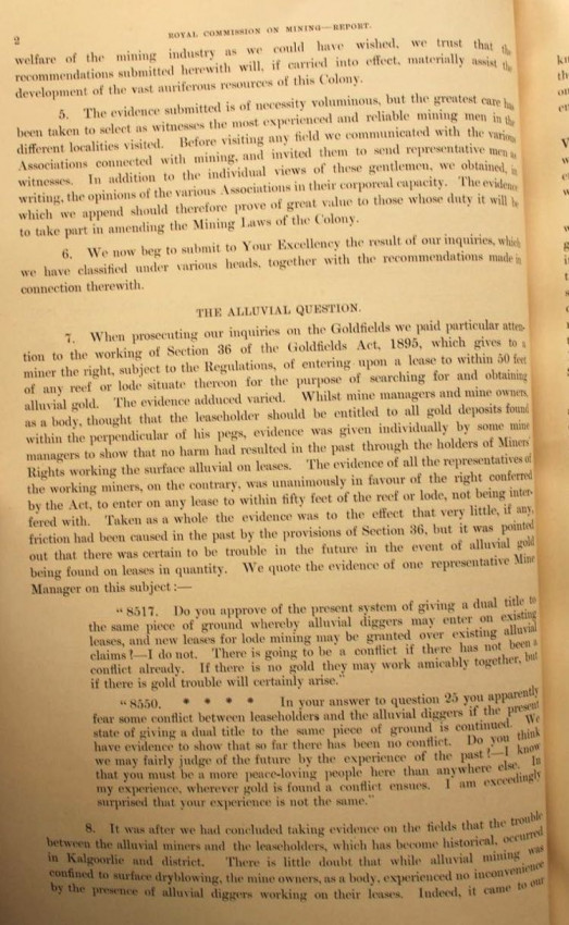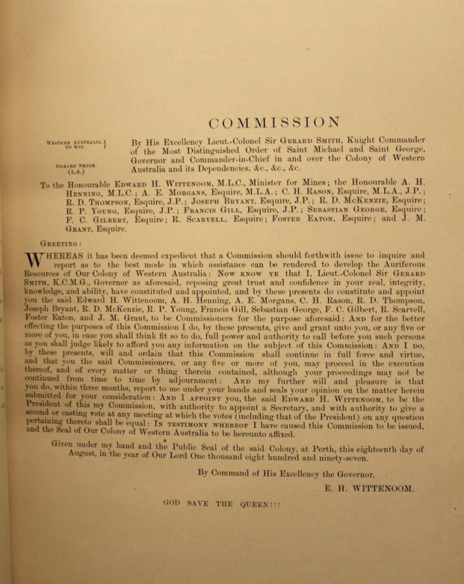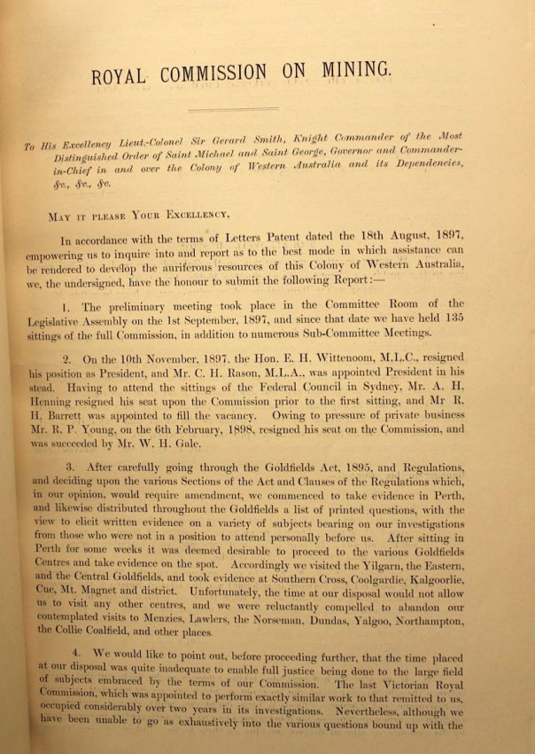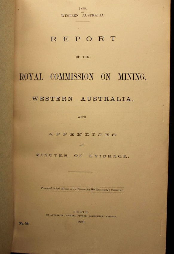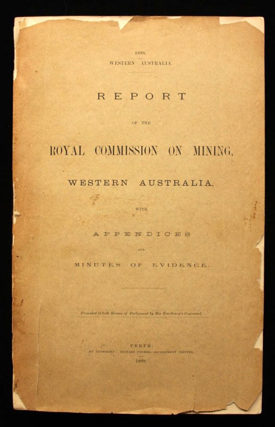 "Report of the Royal Commission on Mining, Western Australia, with Appendices and Minutes of Evidence. Presented to both Houses of Parliament by His Excellency's Command."