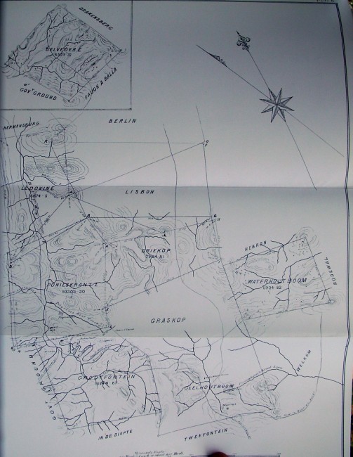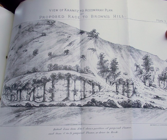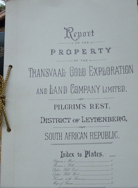 Report on the Property of the Transvaal Gold Exploration and Land Company Limited, Pilgrim's Rest, District of Leydenberg, South African Repulic,1884, (facsimile reprint) gifted to members of The Transvaal Provisional Administration by the management of Rand Mine Properties, 6 plates (Pilgrim's Rest; Brown's Hill; Ophir Hill East; Ophir Hill West; Krantz, with Fluming; Map of Farms), bound with card and gilt thread, 210 x 335mm, 490 x 335mm (plates), condition: very good.