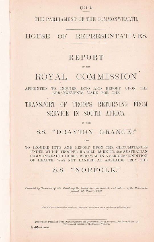 Appointed to inquire into the report upon arrangements made for the Transport of Troops Returning from Service in South Africa" in the S.S. Daryton Grance" and to inquire into and report upon the circumstances under which trooper Harold Burkitt" 2nd Australian Commonwealth Horse" who was in a serious condition of health" was not landed at Adelaide from S.S. "Norfolk."