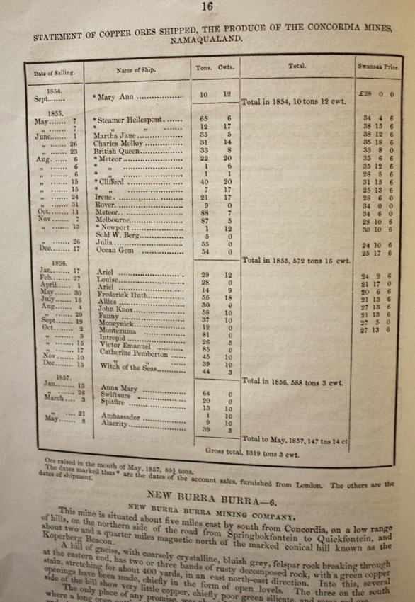 There is also a list or "Statement" of produce from the Concordia Mines, Namaqualand, indicating the names of the ships used to carry ore to Swansea, Wales between 1854-57 with prices realised. The dates of sailing and the amounts of ore carried are also included.