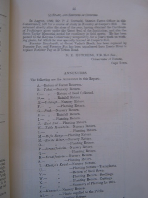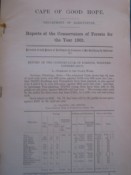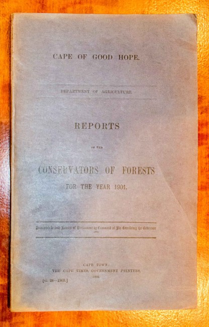 As before, there are four conservancy reports, for the Western, Midlands, Eastern and Transkei conservancies. Compared with the 1899 report, the pagination has increased from 115 to 175, making this both a fascinating and a detailed report by forestry officers who in addition to their beeding, planting and harvesting duties built up a rapport with the public that was a major contributor to the greening of the present Cape Province and to private revenues from forest products.